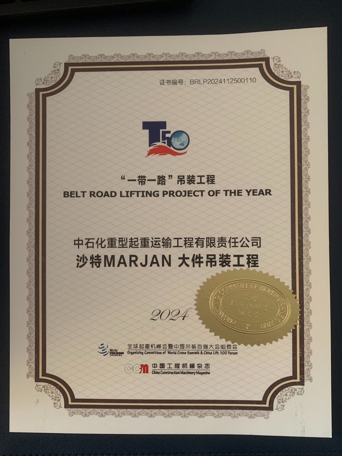 沙特MARJAN大件吊装工程荣获2024年“一带一路”吊装工程
