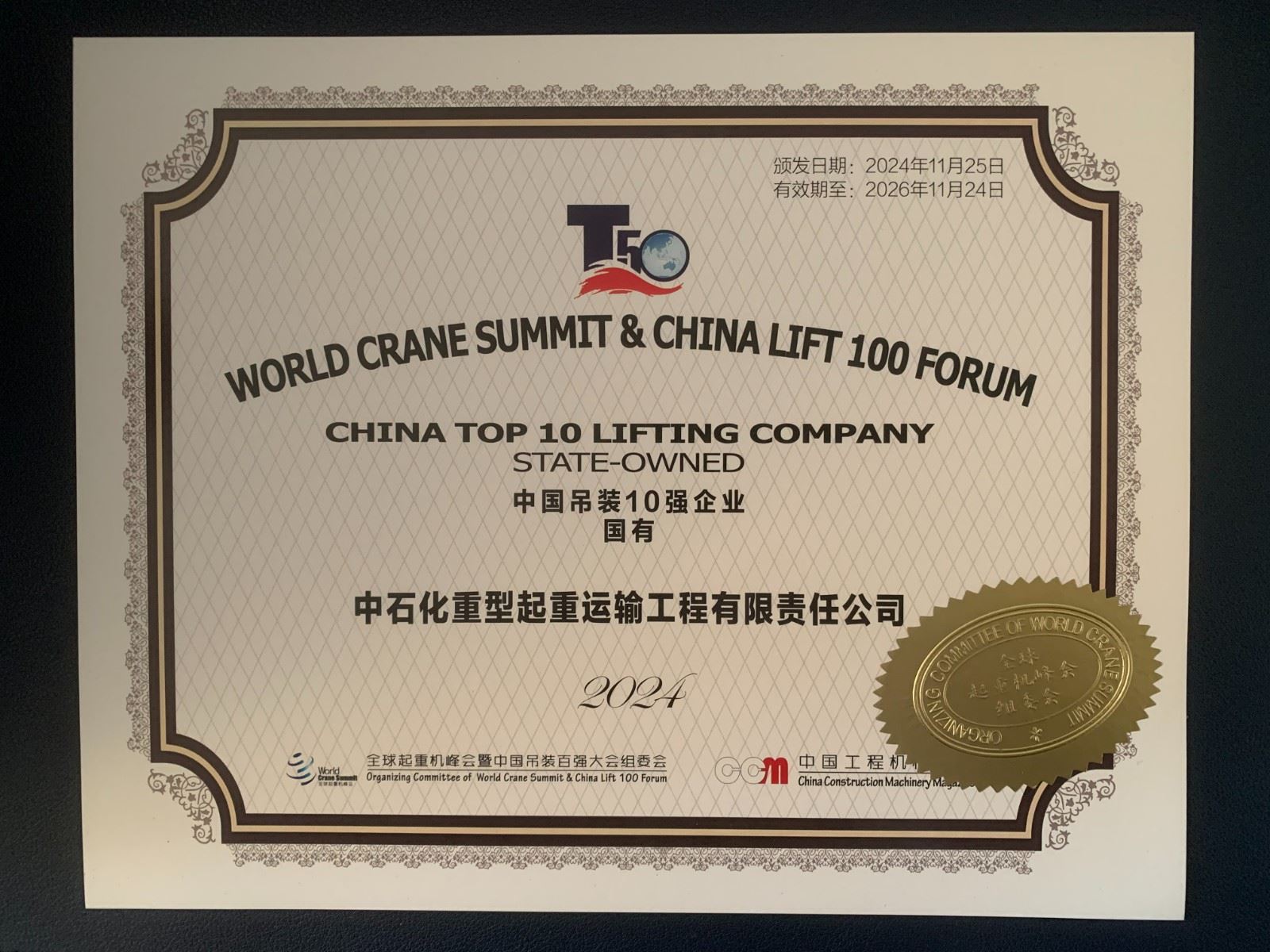 起运公司蝉联中国吊装10强企业(国有)榜首(2024-2026年)